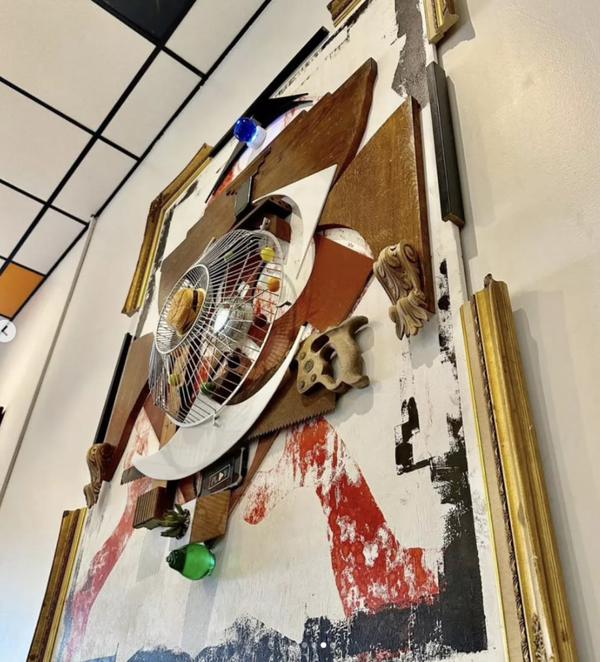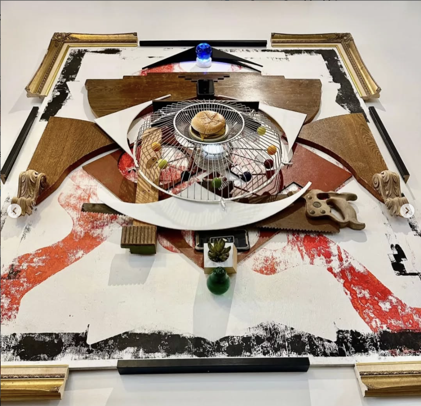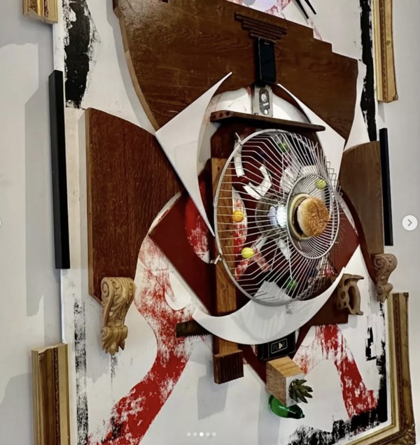 Foreverlutionary Man, framed with both traditionally ornate and mass-produced materials, represents the inevitable process of change across our society and culture with the passing of time. With modern technology representing distraction and escapism juxtaposed with the craftsmanship of a bygone era, it’s both a literal and figurative depiction of how seemingly more sh!t hits the fan with ever-evolving generations. My nan's headboard and grandfather's wood saw beside other items of their time, lead to a truly well-known symbol of ours being illuminated by the heart of Foreverlutionary Man, who is falling victim to convenience culture and a consumerism society.