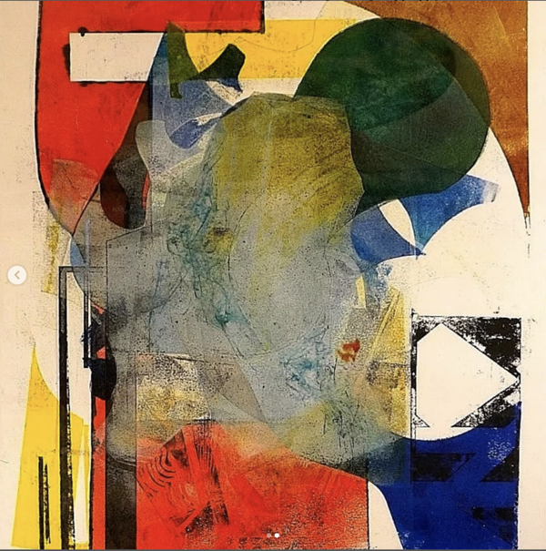 Abstract woodblock ink print on paper.