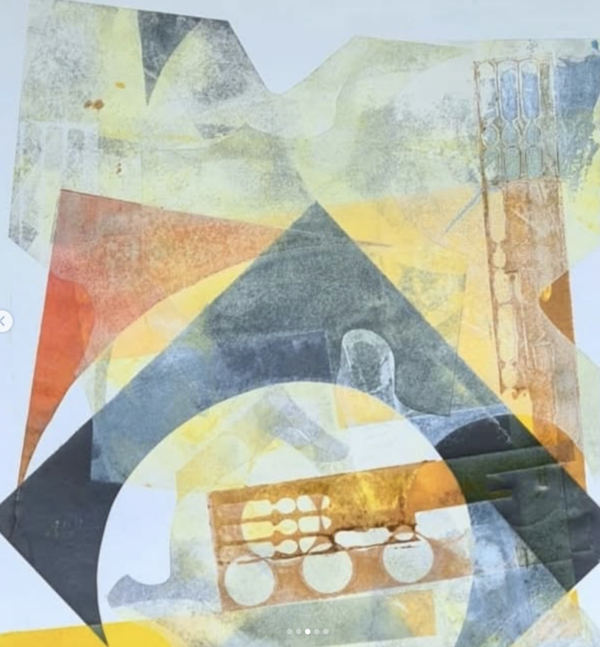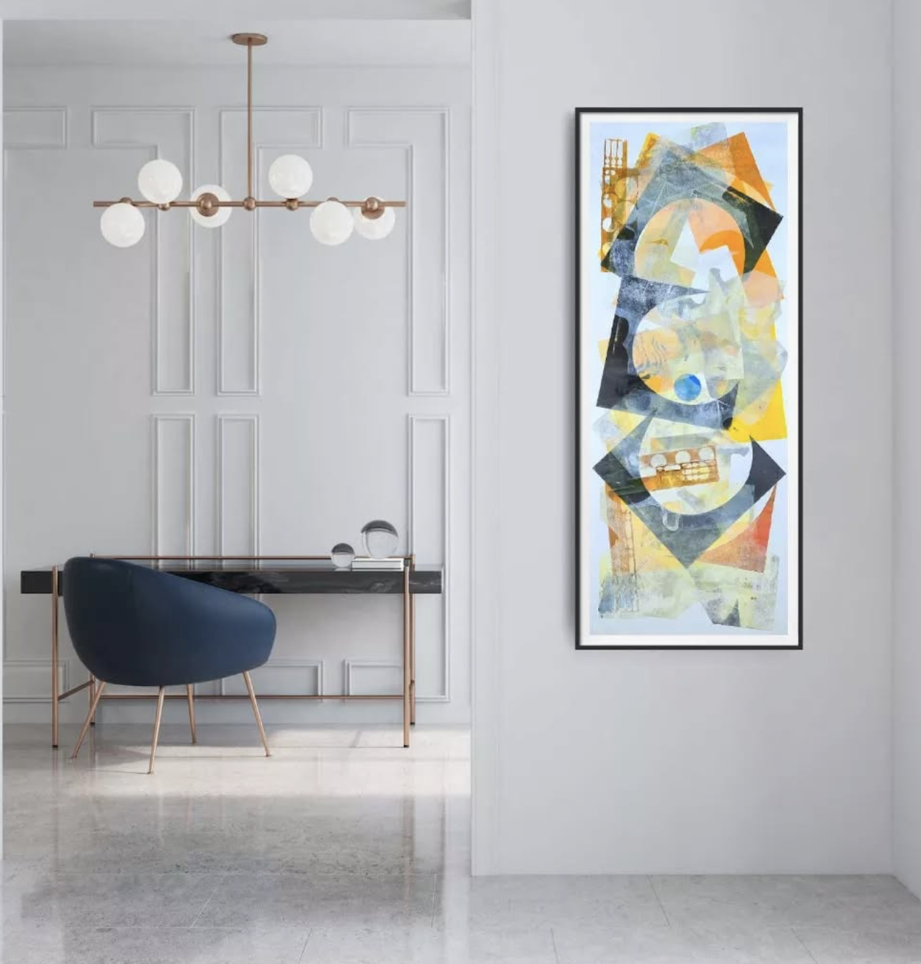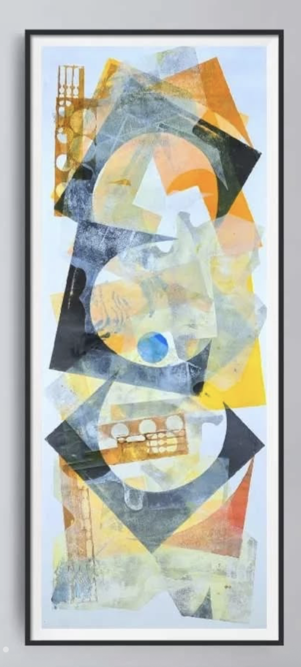 Big yellow, woodblock ink print on paper. Primitive geometric pattern created using discarded wood scraps.Measurement 150 cm length x 60 cm wide.Original print available and copies.Inquiries welcomed.
